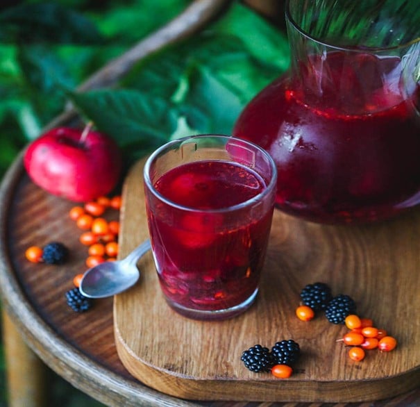 Le kompot : boisson sucrée traditionnelle préparée avec des fruits et/ou baies bouillies dans de l’eau sucrée puis infusées. Il est servi frais.