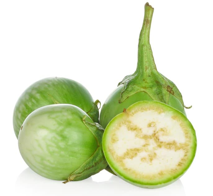 Emplois de l’aubergine thaïlandaise : Les variétés vert-blanc d’aubergines thaïlandaises sont des ingrédients essentiels dans les plats de curry thaïlandais tels que le kaeng tai pla, le curry vert et le curry rouge.