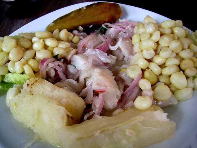 Au Pérou, le choclo est couramment servi en accompagnement de plats tels que le ceviche et le leche de tigre, et sa forme grillée et salée, semblable à des cacahuètes grillées, est habituellement offerte gratuitement aux clients du restaurant lorsqu’ils sont assis (Voir Maïs grillé).