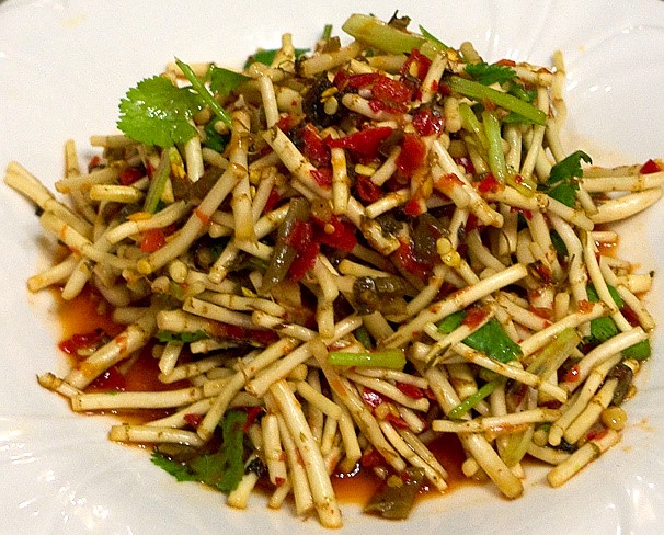 Le zhe’ergen est souvent servi en salade froide après avoir été lavé, coupé en dés et mélangé avec des sauces à base de vinaigre, de piment, de coriandre et de sauce soja.