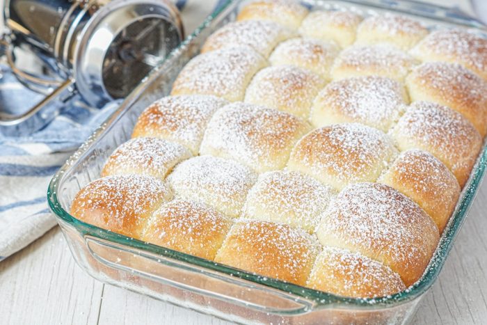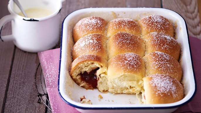 Buchteln (pâtisserie) : Les Buchteln sont des petits pains briochés faits de pâte levée, remplis de confiture, de graines de pavot moulues ou de fromage caillé et cuits au four dans des plats les gardant collés entre eux. Le Buchtel traditionnel est rempli de powidl (confiture de prunes). Les Buchteln peuvent également être recouverts de sauce à la vanille, de sucre en poudre ou de sucre glace et se mangent tels quels et tièdes.