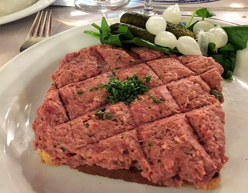 Cannibale (cuisine belge) : Le cannibale est une spécialité belge, composée d'un toast recouvert de filet américain (une variante belge du steak tartare).