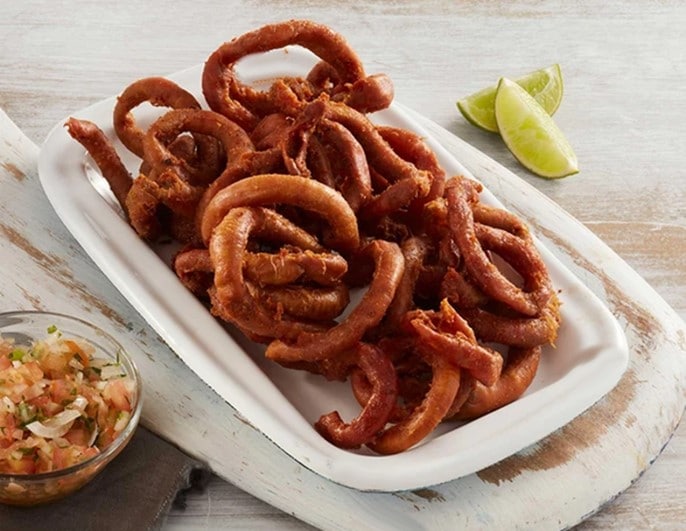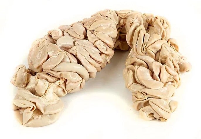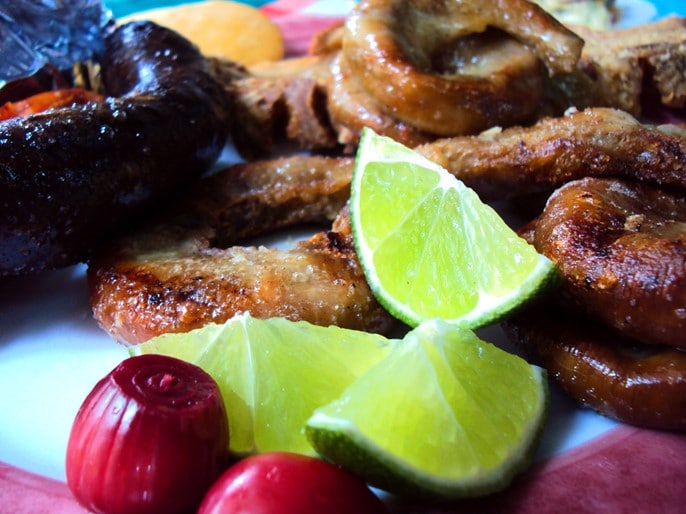 Mexique : Dans le sud du Mexique, la première partie de l’intestin grêle de la vache (3 à 4 premiers mètres) est connue sous le nom de « tripa de leche » (qui se traduit par « boyau de lait »). Celui-ci est soigneusement lavé à l’eau du robinet, tressé et bouilli dans un autocuiseur pendant environ une heure, car il est très dur. Plus tard, il est frit avec de l’ail et des oignons et servi sur des tortillas fraîches, entières ou coupées en cubes, servies avec de la salsa chaude.
