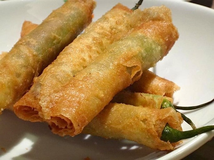 Dinamita (cuisine philippine) : La Dinamita (également connue sous le nom de Dynamite ou Lumpiang Dynamite) est une collation philippine frite composée de piment siling haba (longs piments verts) farcis et enveloppés dans une fine crêpe aux œufs. La farce est généralement du giniling (viande de bœuf ou porc hachée), du fromage ou une combinaison des deux, mais elle peut également être adaptée pour utiliser une grande variété d’ingrédients, y compris le tocino (bacon espagnol), le jambon et le poulet émincé. La Dinamita est également connue sous le nom de dynamite lumpia, entre autres noms.
