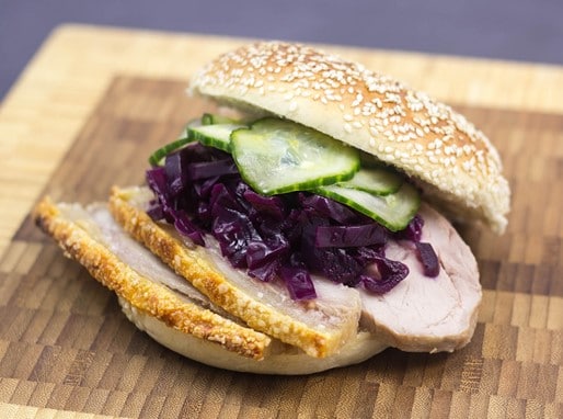 Sandwiches : Le Flæskesteg med rødkål (littéralement : rôti de porc au chou rouge) est également servi froid sur du pain noir de seigle danois sous forme de sandwich ouvert, connu au Danemark sous le nom de smørrebrød. Les tranches fines de rôti de porc doivent, bien entendu, être servie avec leur croustillant. Le sandwich peut être décoré avec du chou rouge, des pruneaux, une tranche d’orange et du concombre mariné au vinaigre.