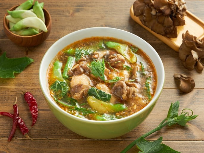Les ingrédients du plat sont les feuilles de bétel, de coriandre chinoise, de cha-om (senegalia penata) et d’acmella, les noyaux secs de la fleur de bombax, les fleurs de colibri végétal, les courges de lierre, les aubergines, des aubergines de pois, les pousses de bambou, les aubergines thaïlandaises, les piments frais et les champignons.
