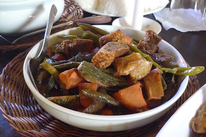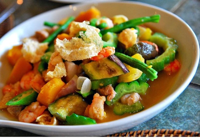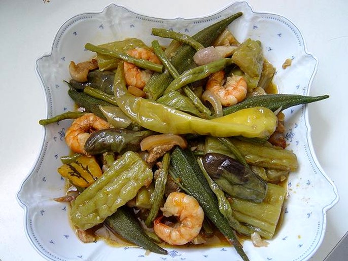 Description et variantes : Le pinakbet est un assortiment de légumes coupés en morceaux et cuits dans du bagoong (pâte de poisson fermentée) et un peu d’eau. Une casserole en argile (palayok) est traditionnellement utilisée. Des légumes locaux sont utilisés, comme du melon amer, des aubergines, des okras, des tomates, des oignons, du gingembre. Si différents assortiments de légumes sont possibles, le melon amer est toujours inclus dans la version traditionnelle, ce qui lui donne un goût amer. Il est servi avec du riz, comme de coutume dans la cuisine philippine. Il peut occasionnellement inclure du poisson ou de la viande.