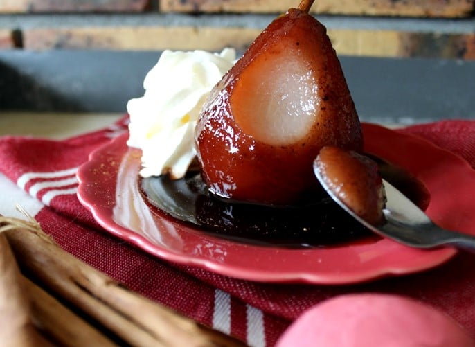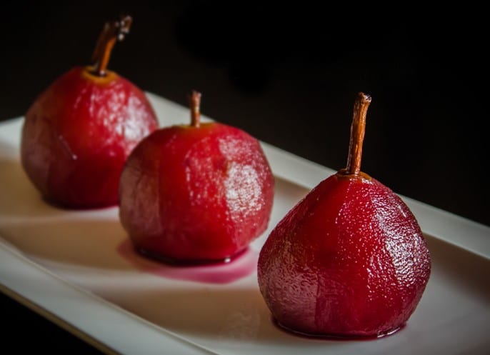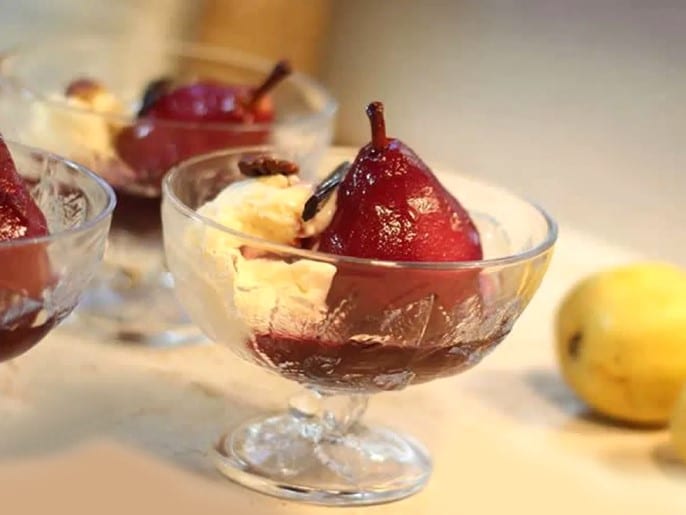 Ingrédients : Pour accommoder les poires au vin rouge, sont utilisés un vin fruité, dans ce cas un beaujolais, du sucre ou du miel, des clous de girofle, des grains de poivre, un morceau de bâton de cannelle, une petite gousse de vanille et un zeste d’orange. Peuvent aussi être utilisés du gingembre et de la cardamome, et pour soutenir la couleur rouge un peu de crème de cassis ou de framboise.