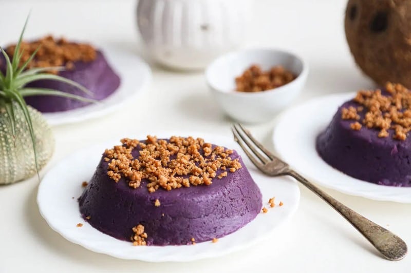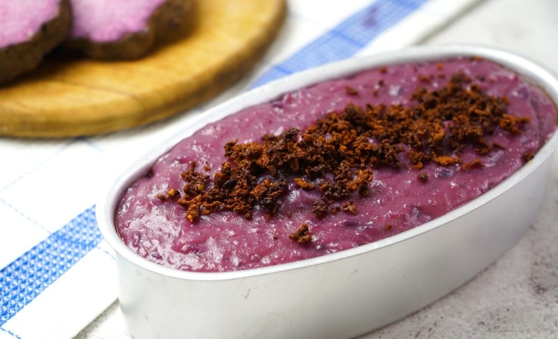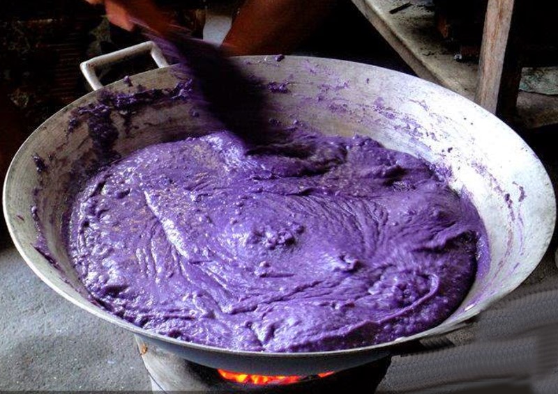 Préparation : L’ingrédient principal est l’igname violette pelée et bouillie qui est râpée et écrasée. La purée d’igname violette, avec du lait concentré (à l’origine du lait de coco sucré), est ajoutée dans une casserole où du beurre ou de la margarine avaient été fondus. Le mélange est agité jusqu’à épaississement. Une fois épaissi, le mélange est refroidi et placé sur un plateau ou dans des récipients de formes diverses.