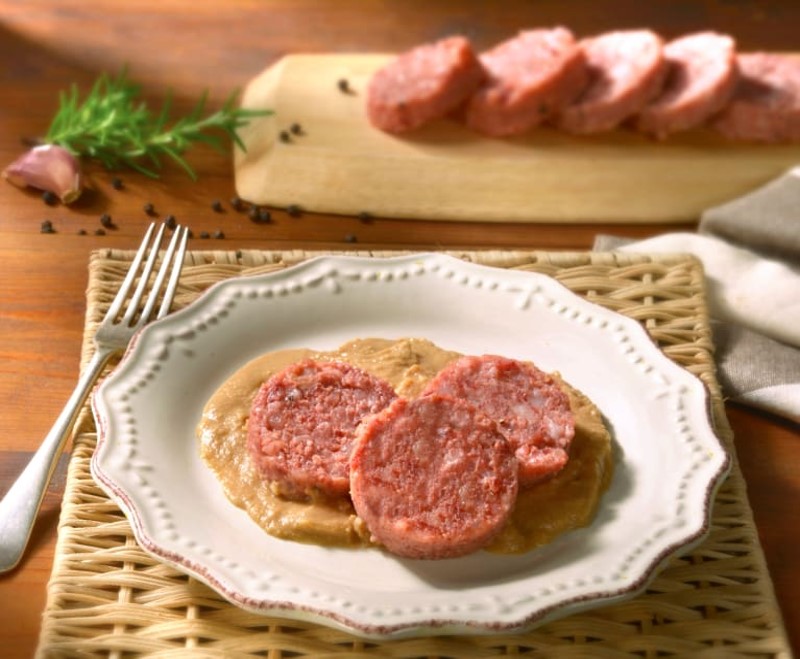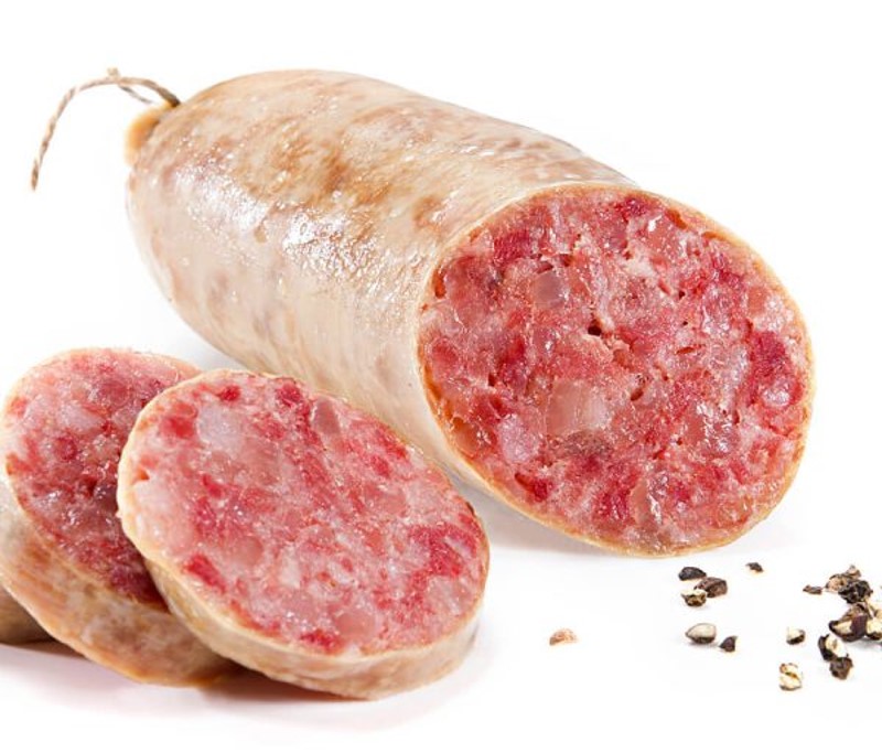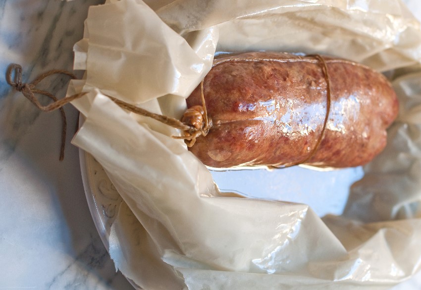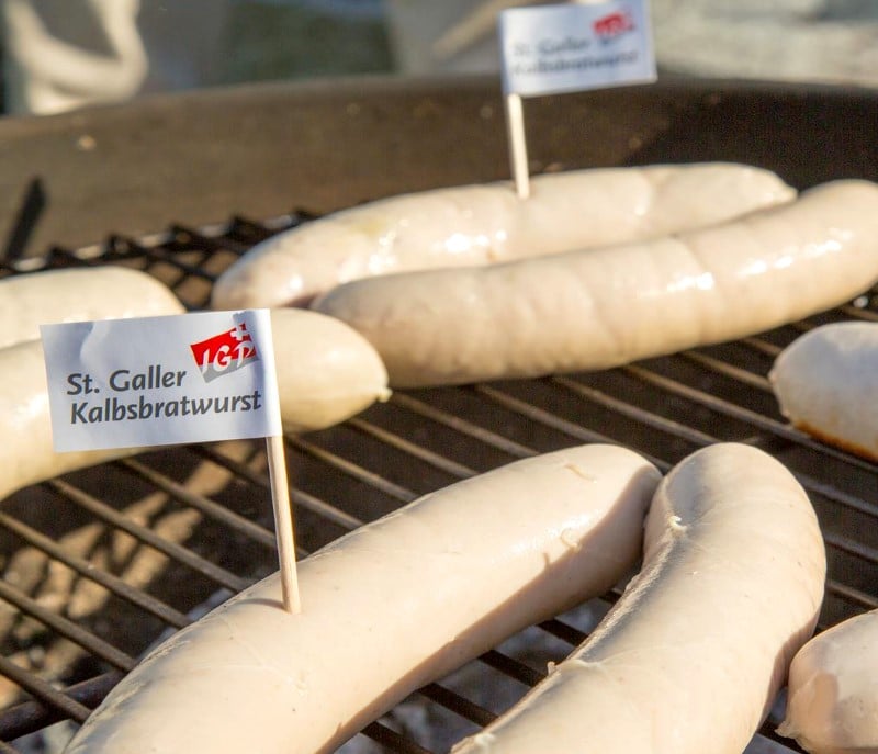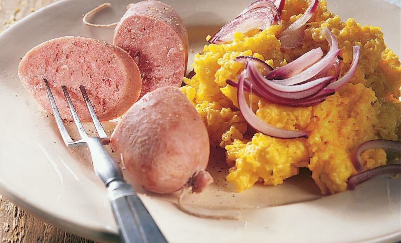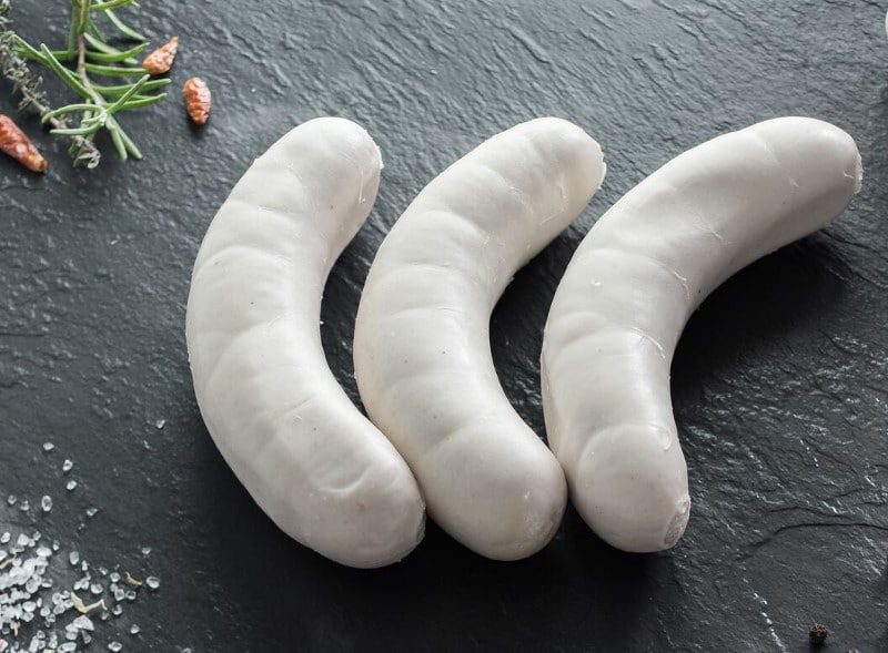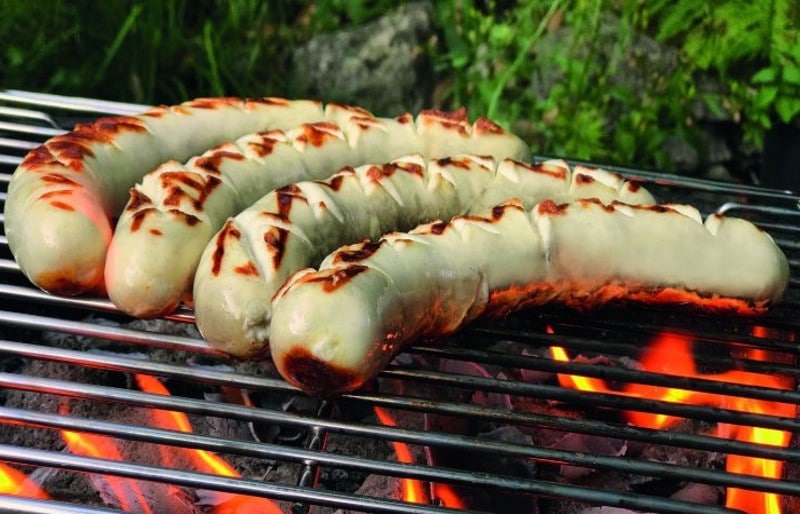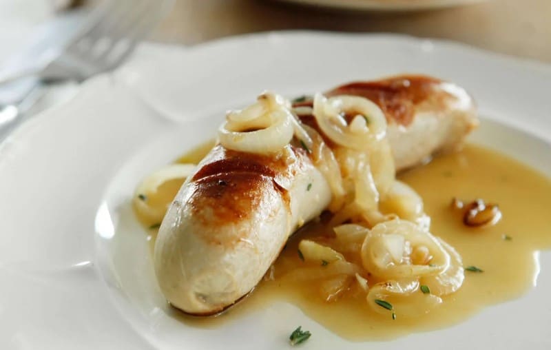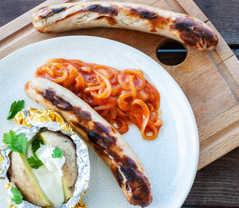 Sandwich à la Bratwurst, oignons frits, moutarde allemande et ketchup