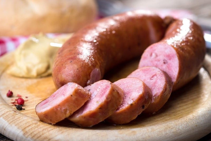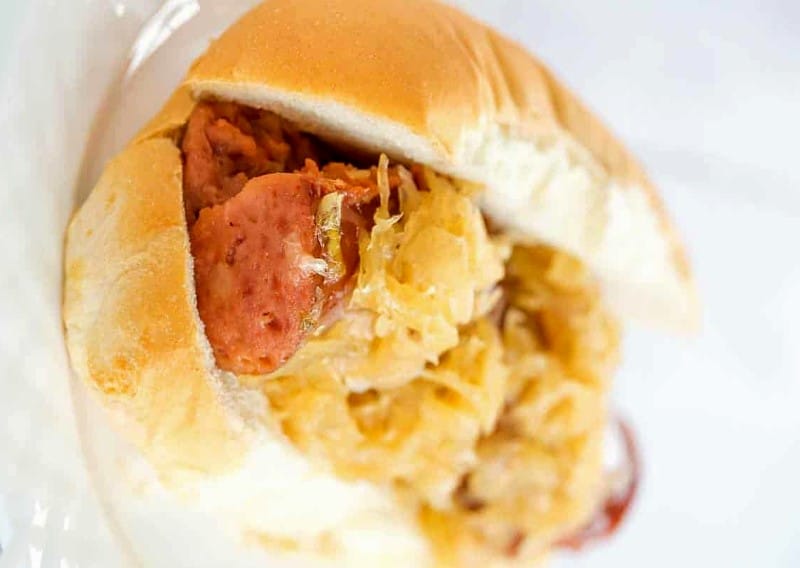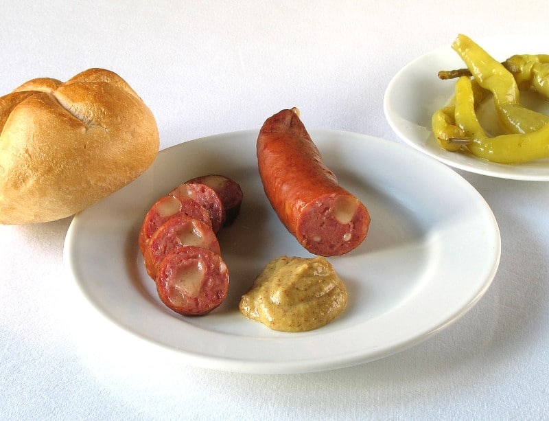 Saucisse Kranjska klobasa, petit-pain et moutarde