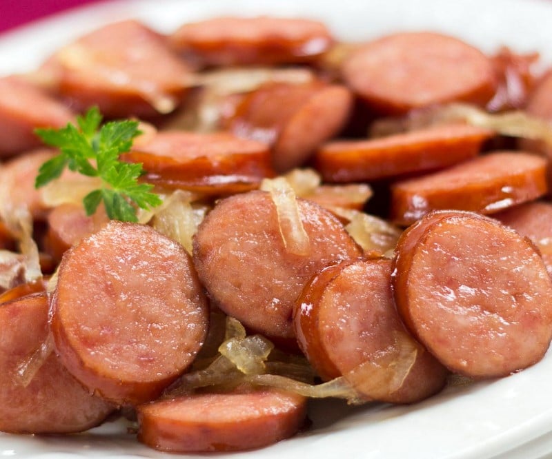 Nürnberger Bratwurst avec choux rouge sauté et purée de pommes de terre aux oignons frits