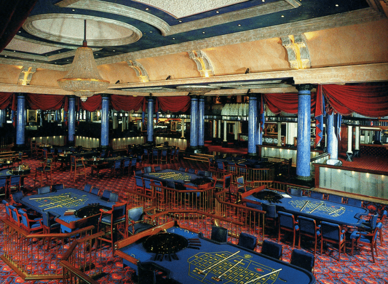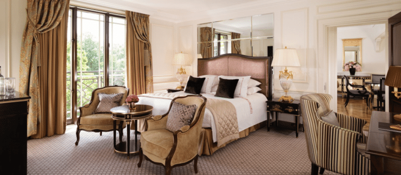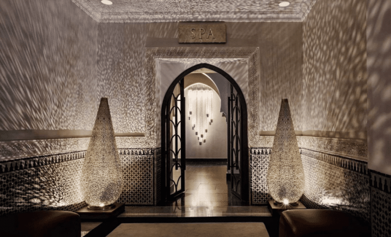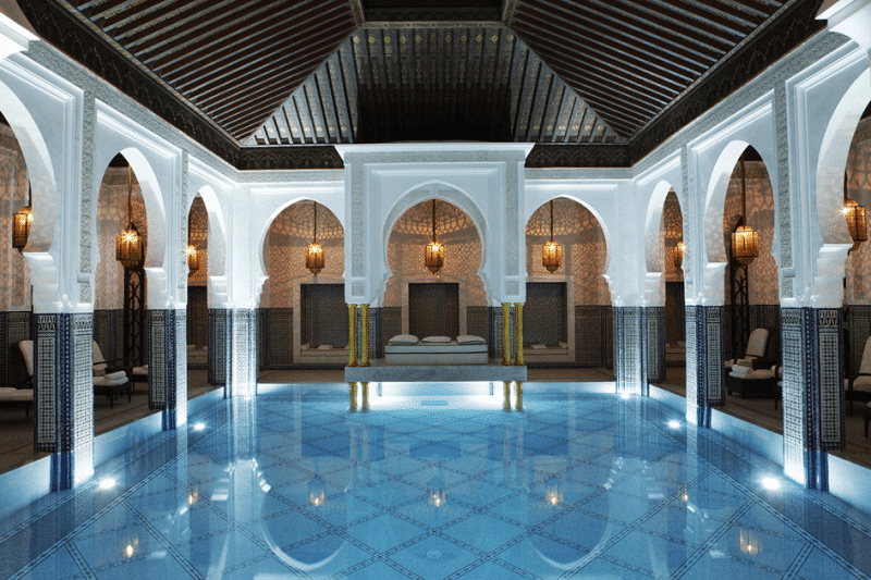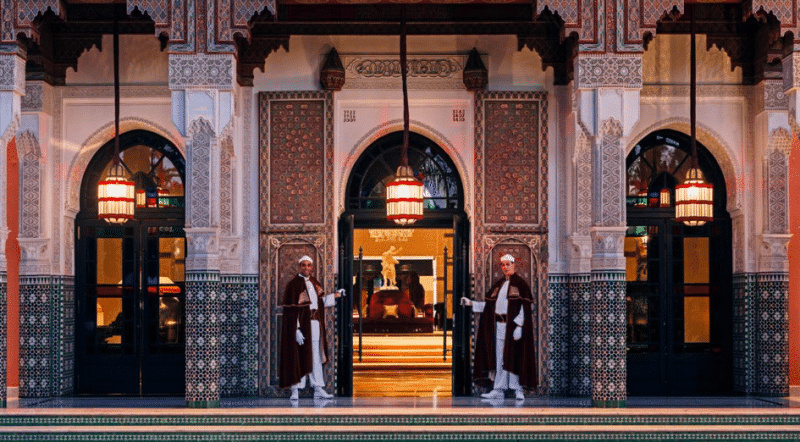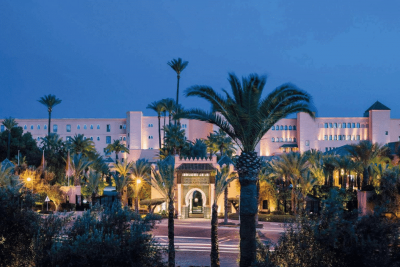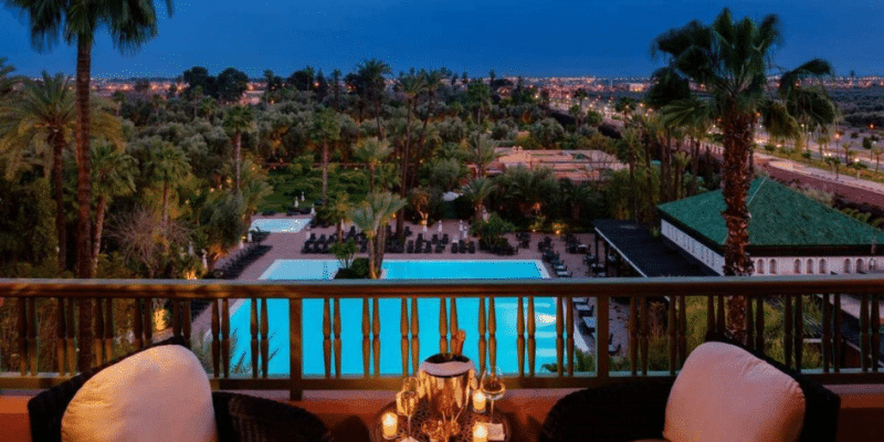 Vue d’une chambre le soir côté piscine à La Mamounia