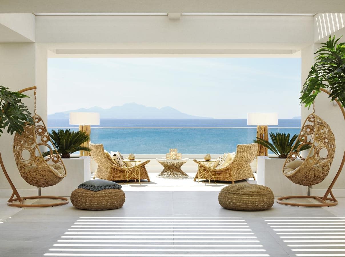 Le salon et la terrasse d’une suite de l’hôtel Ikos Aria