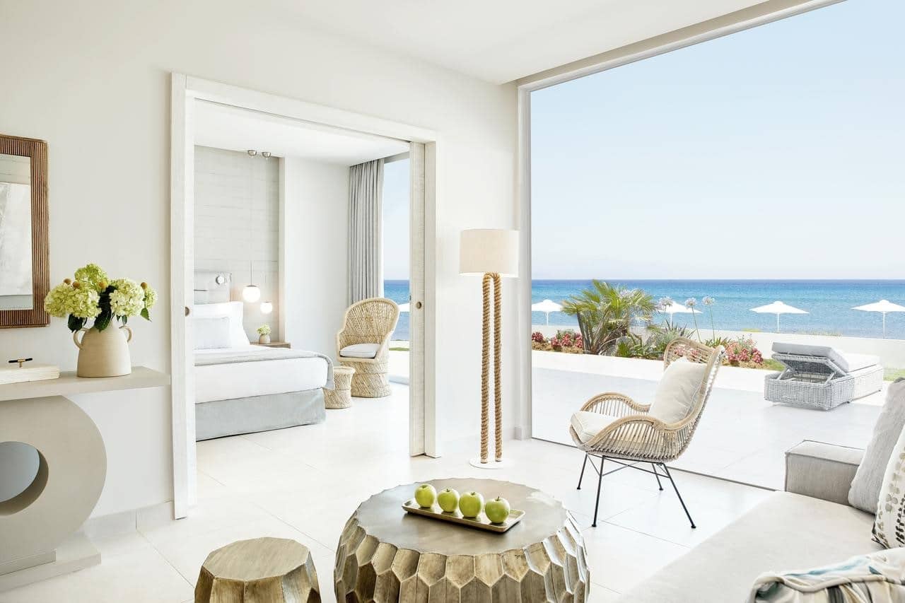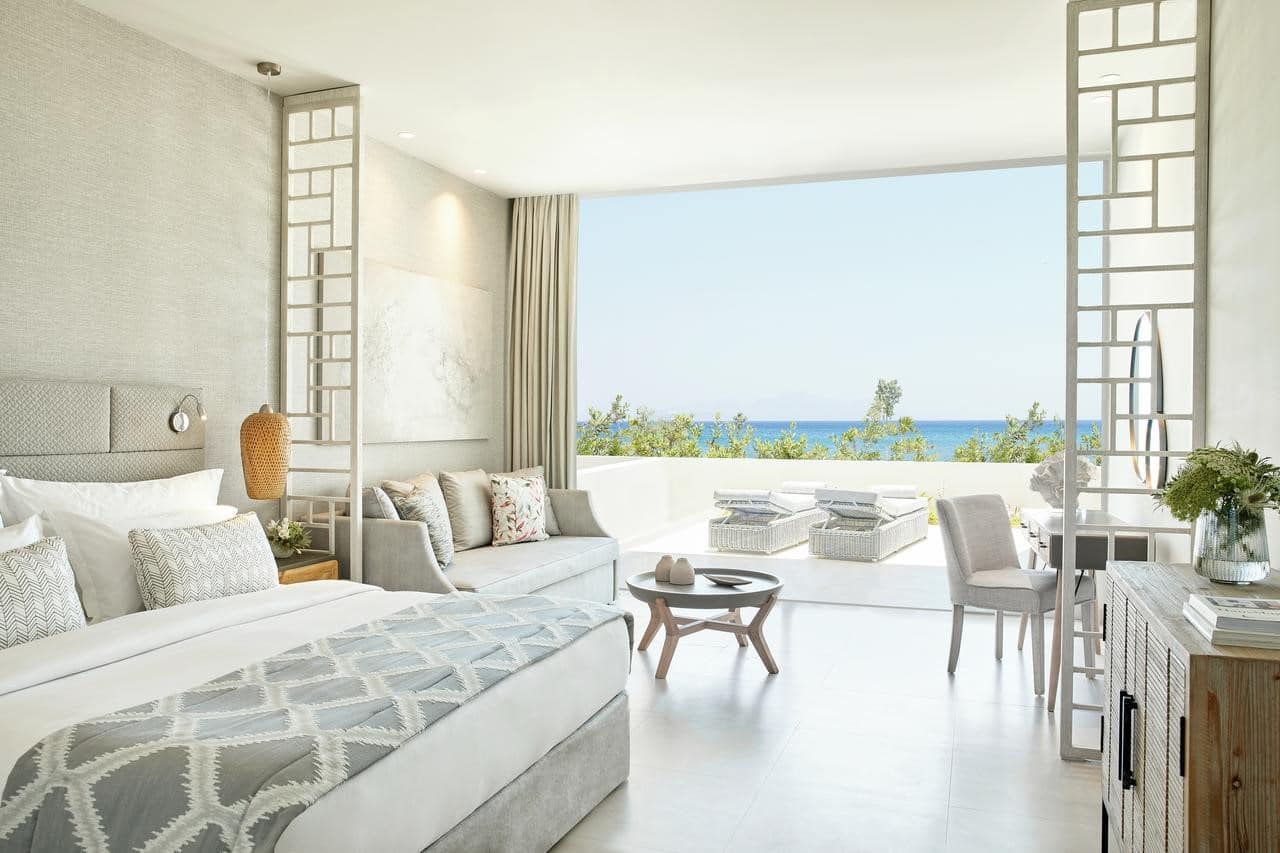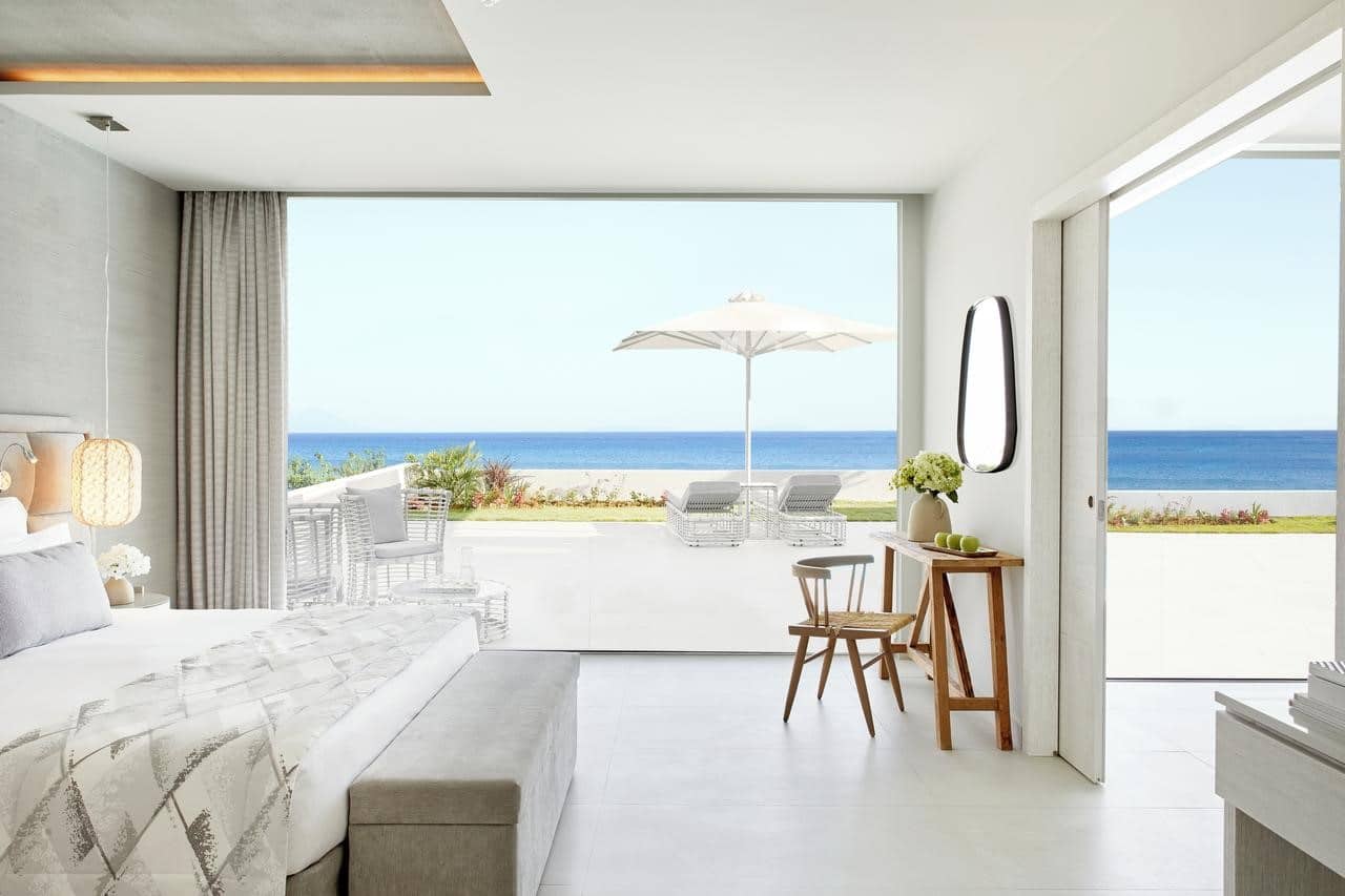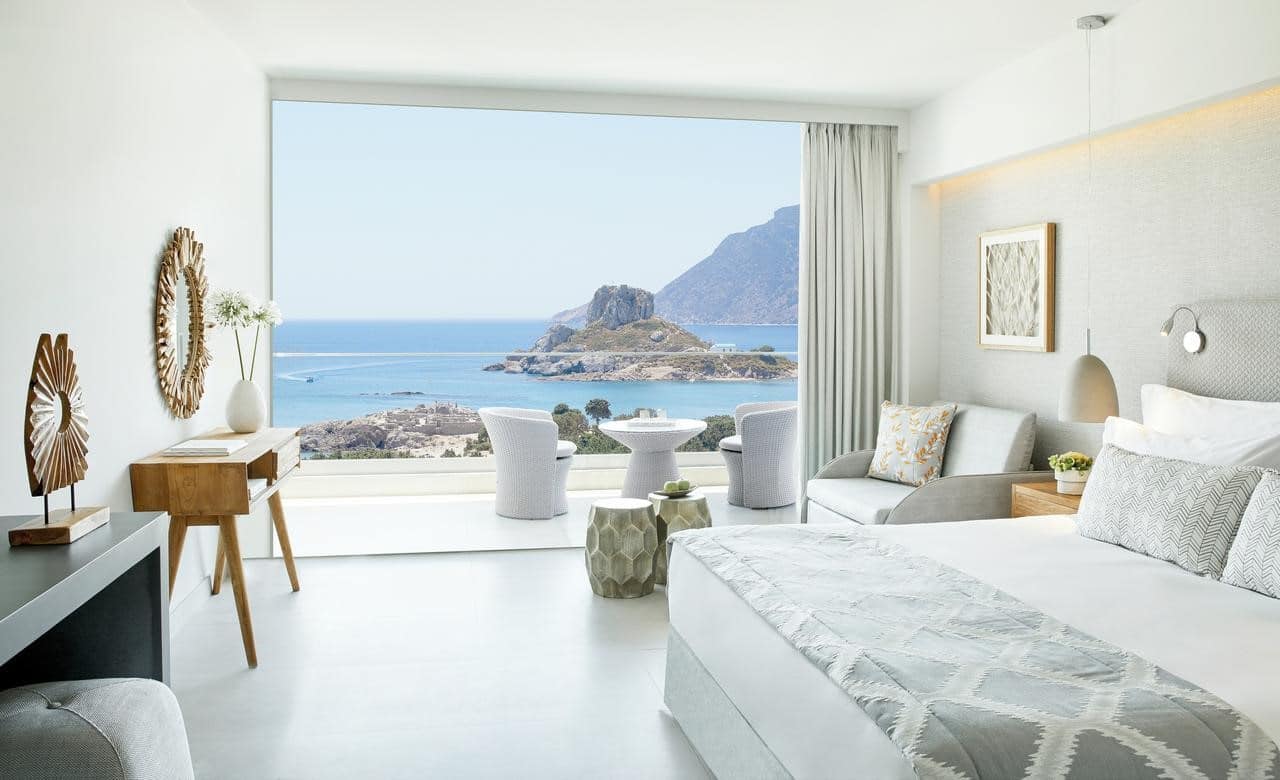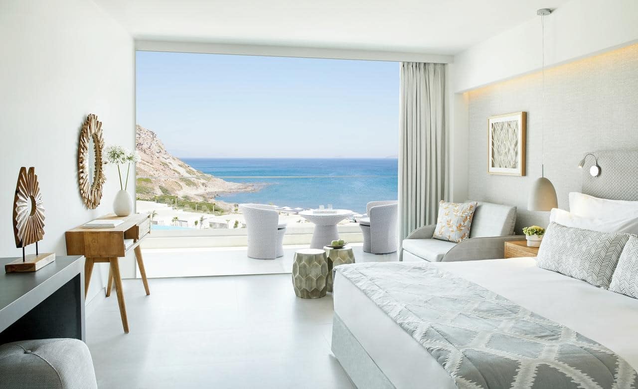 Une autre suite de l’hôtel Ikos Aria avec vue sur l’île de Vrachonisída Palaiókastro