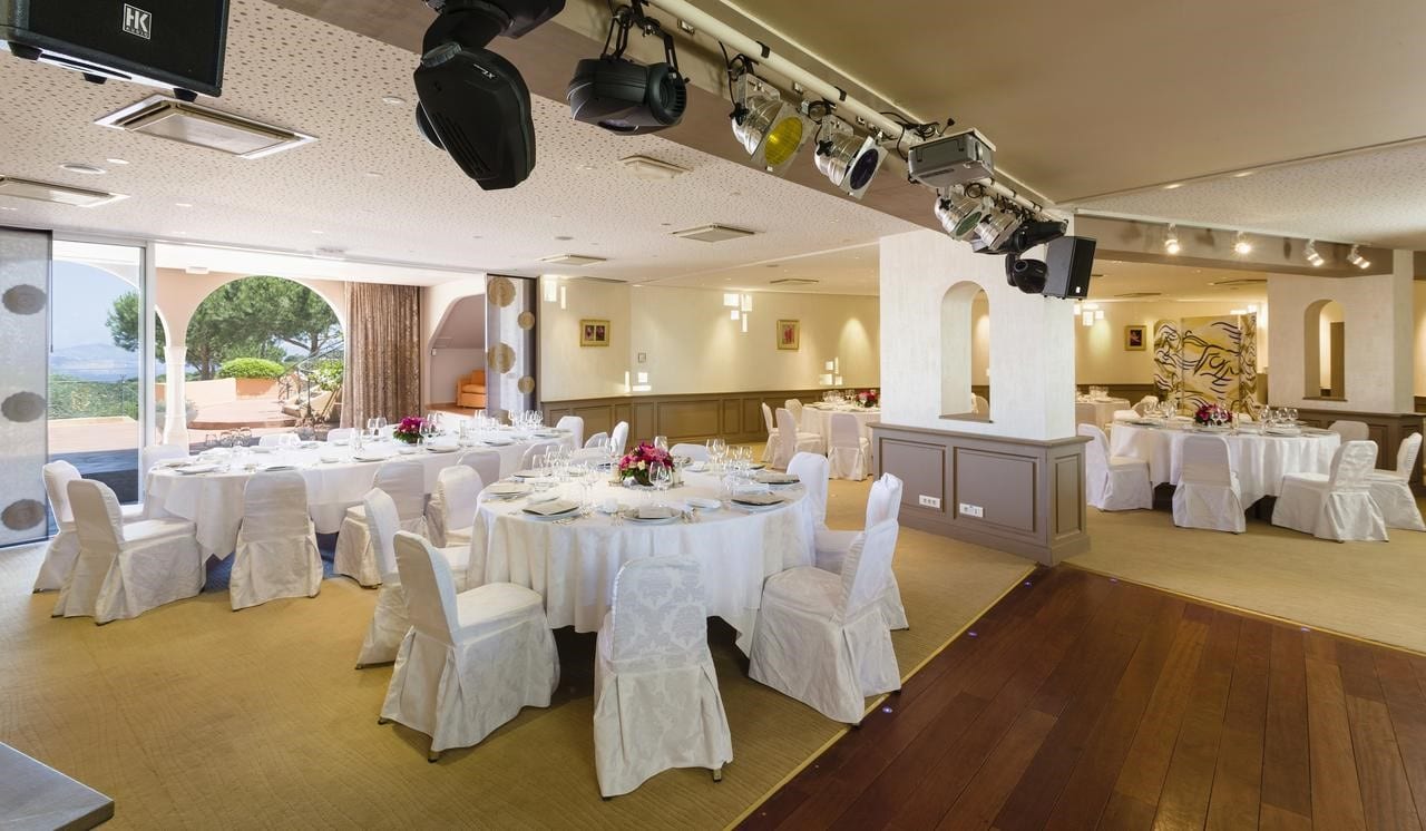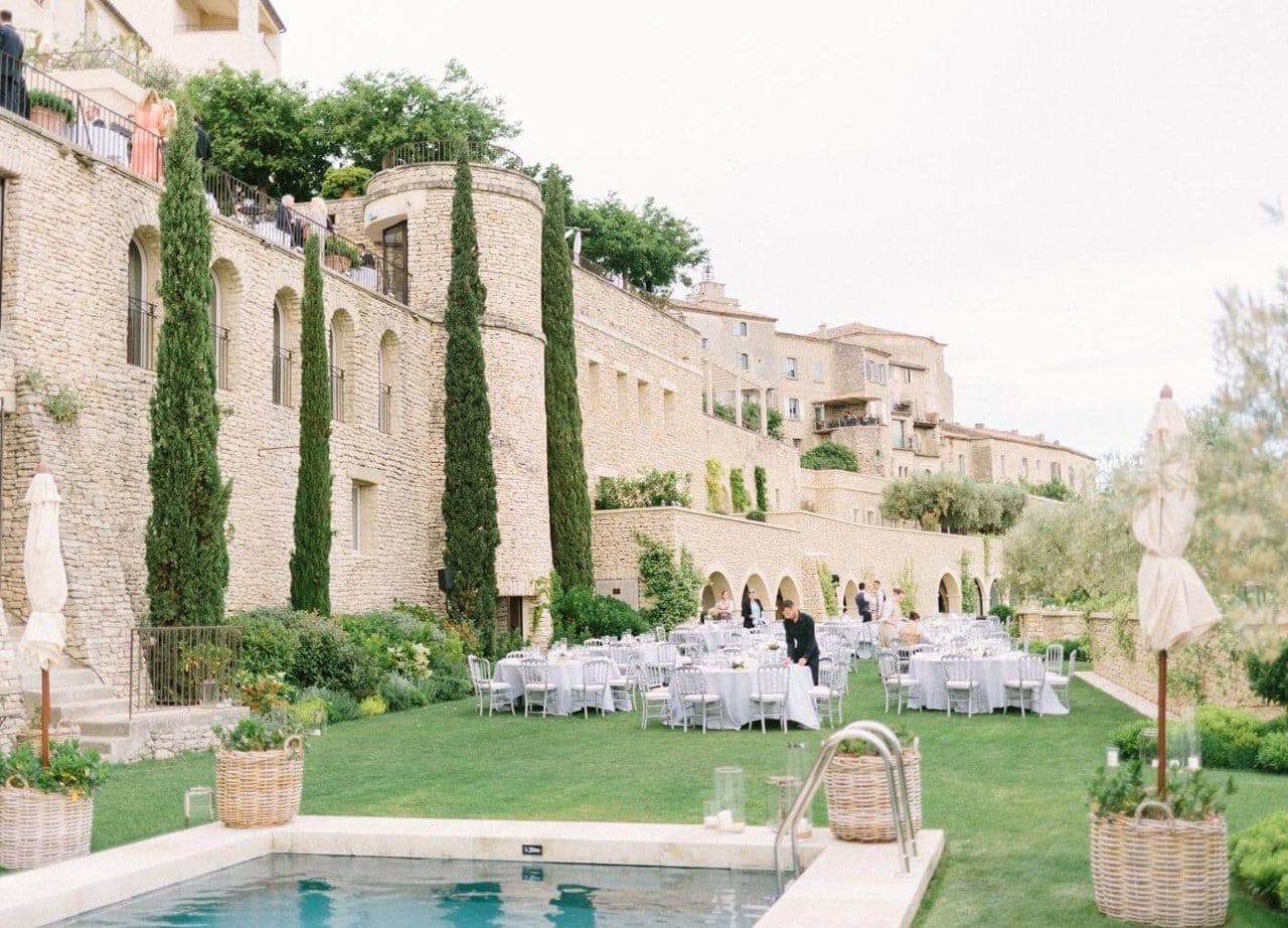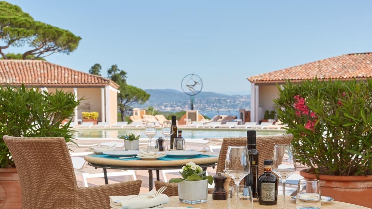Une table du restaurant en bordure de la piscine du Château de la Messardière