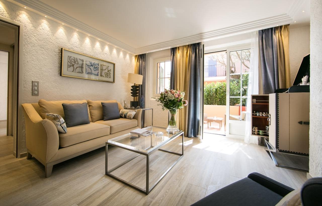 Le salon d’une suite de l’hôtel Le Byblos à Saint-Tropez