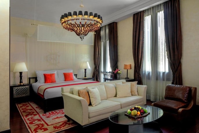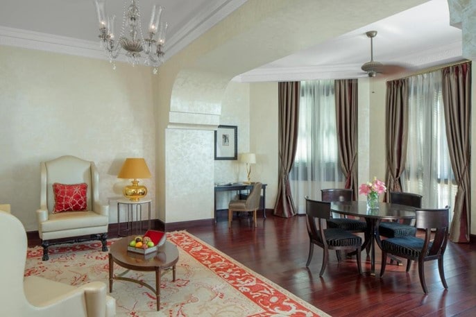 Le salon d’une suite de l’hôtel Old Cataract avec vue sur le Nil et ses felouques