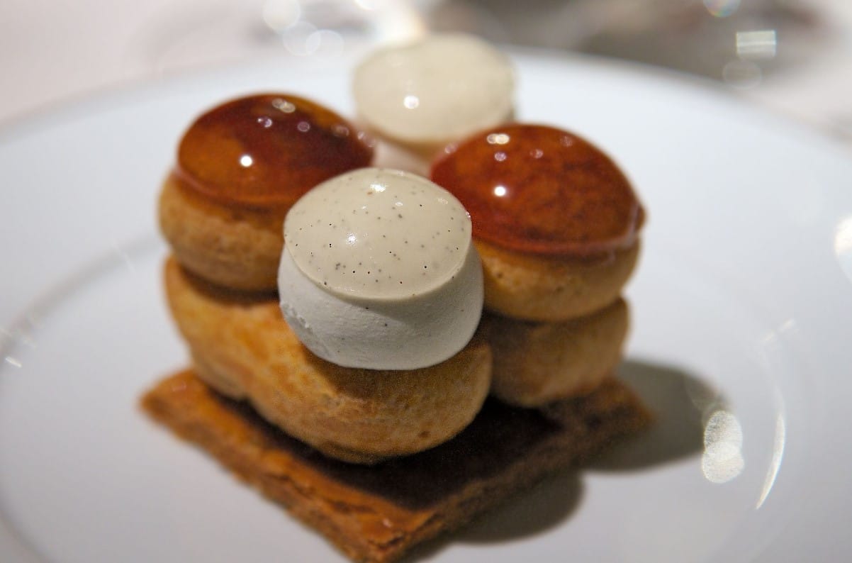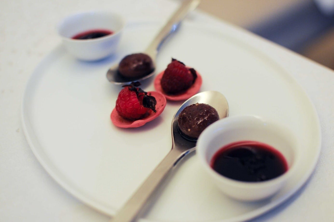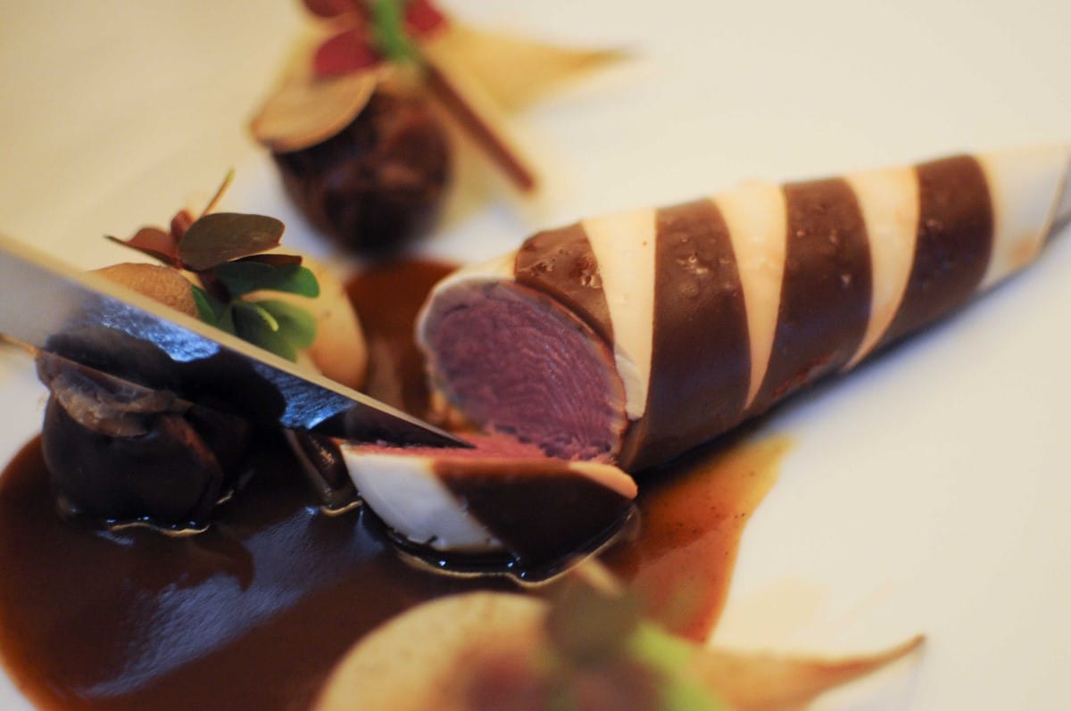 Bille de figue au poivre des cimes, tuile cacao framboise, betterave, hibiscus et cassis