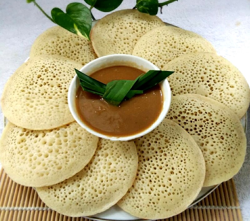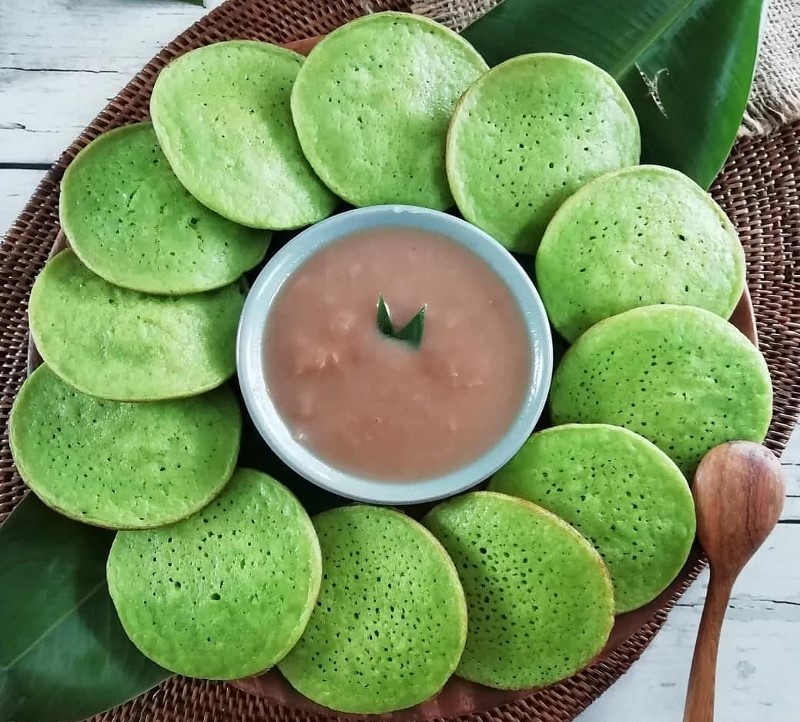 Serabis au jus vert de pandanus accompagnés de sauce kinca