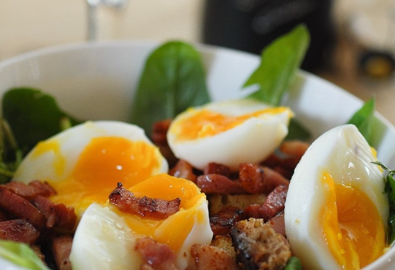 Œufs mollets, lardons et croûtons et salade de pissenlits