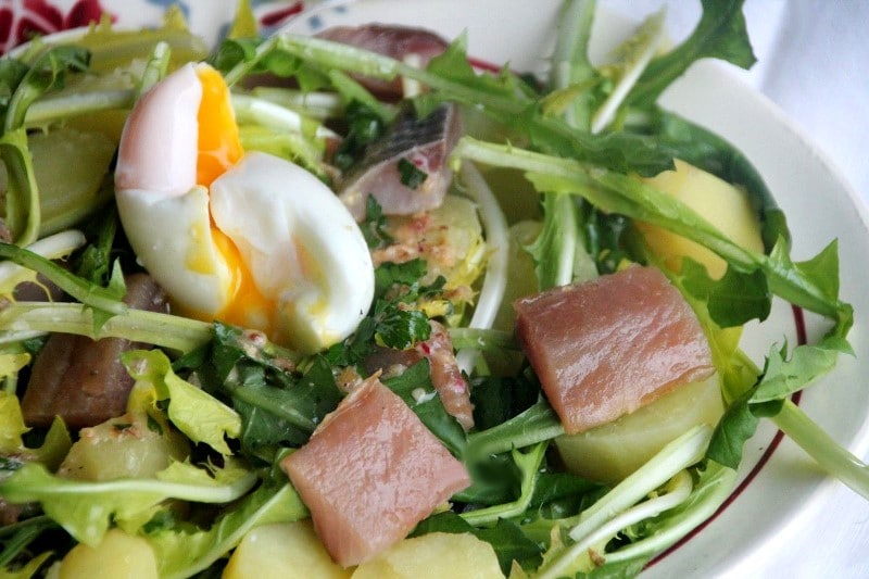 Salade de pissenlits, œuf mollet et hareng fumé