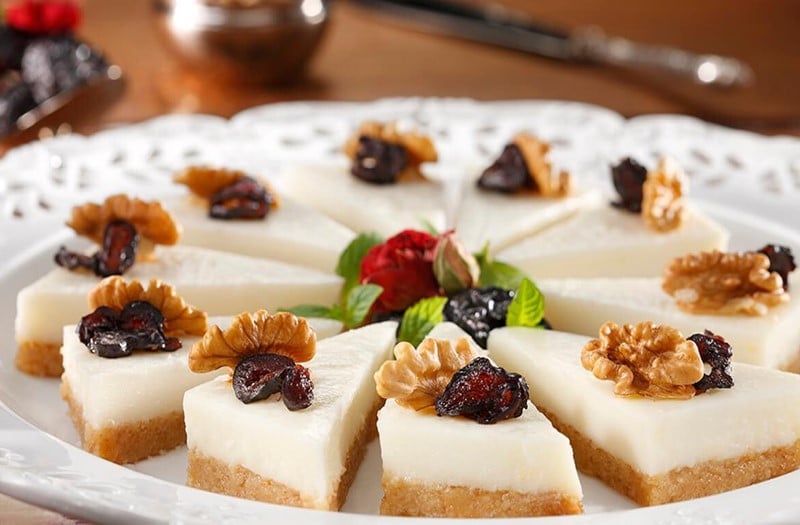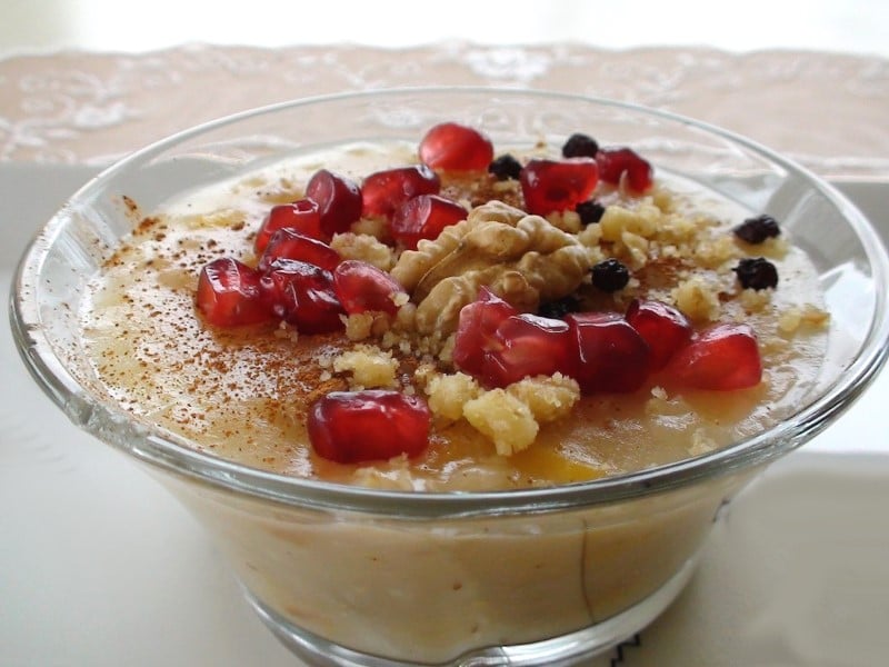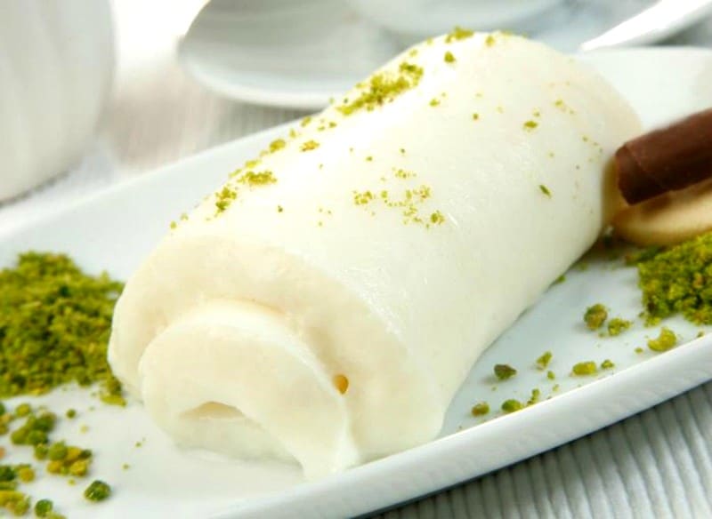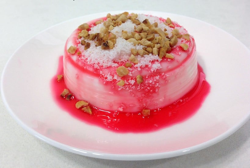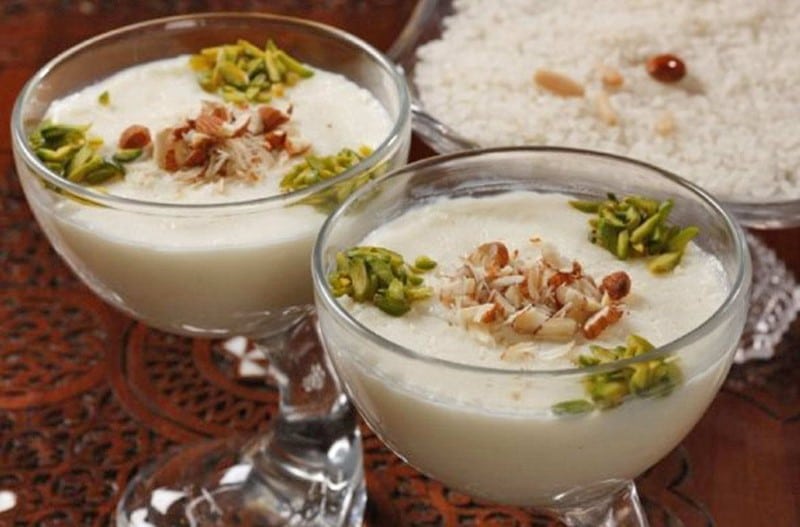 Muhallebi israélien arrosé de sirop de rose, noix de coco et pistaches hachées
