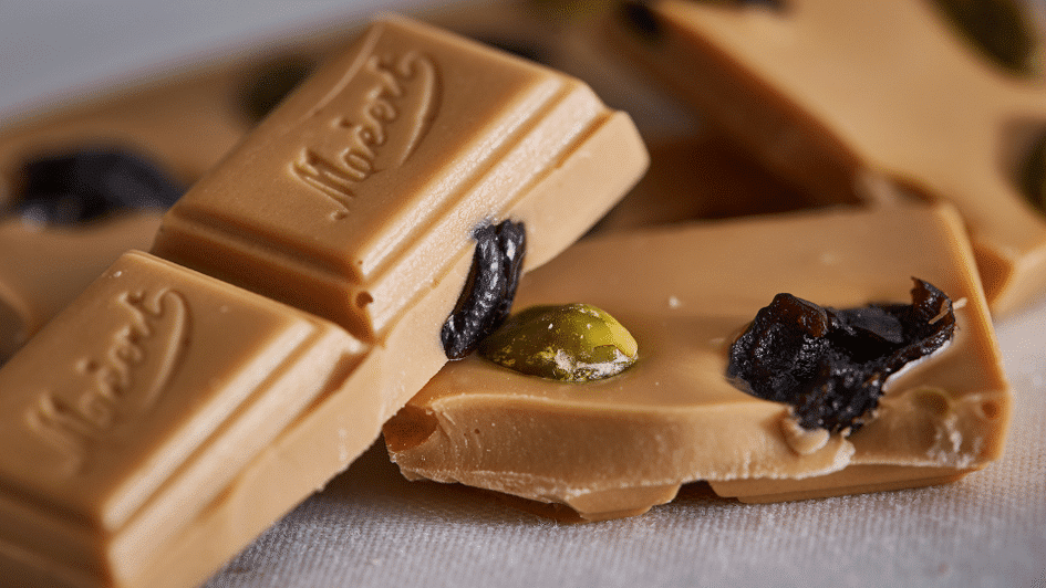 Carrés de chocolat blond aux raisins secs et pistaches
