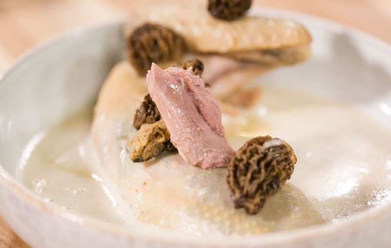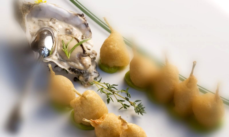 Tempura de cuisses de grenouilles en chaud-froid et huître tiède au champagne