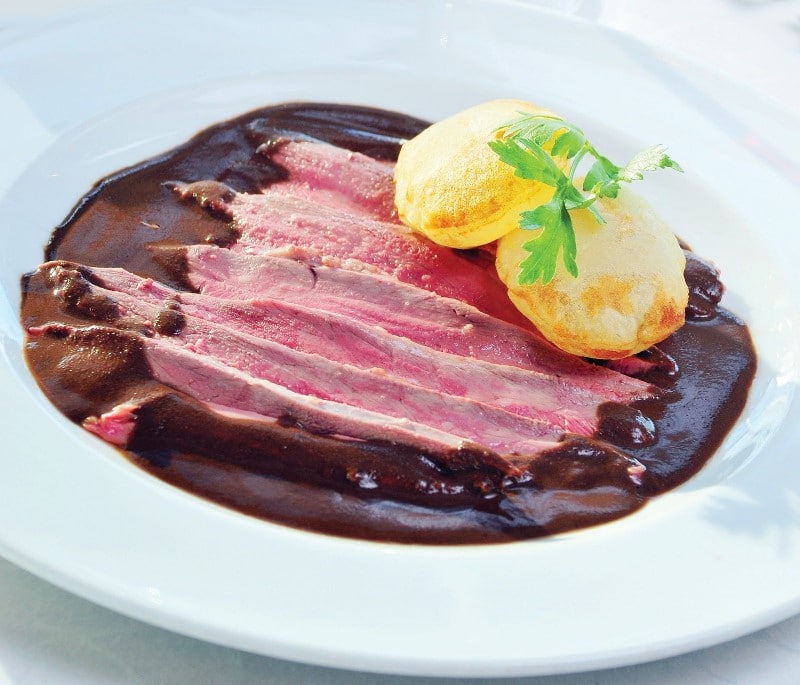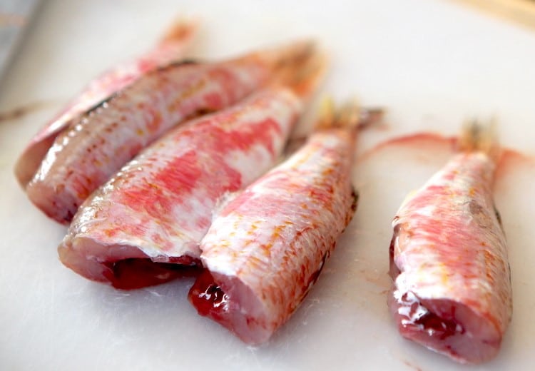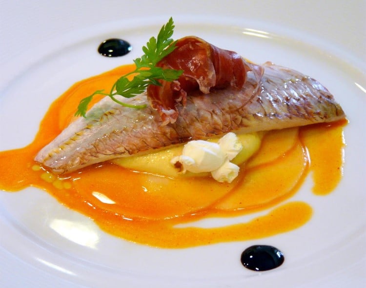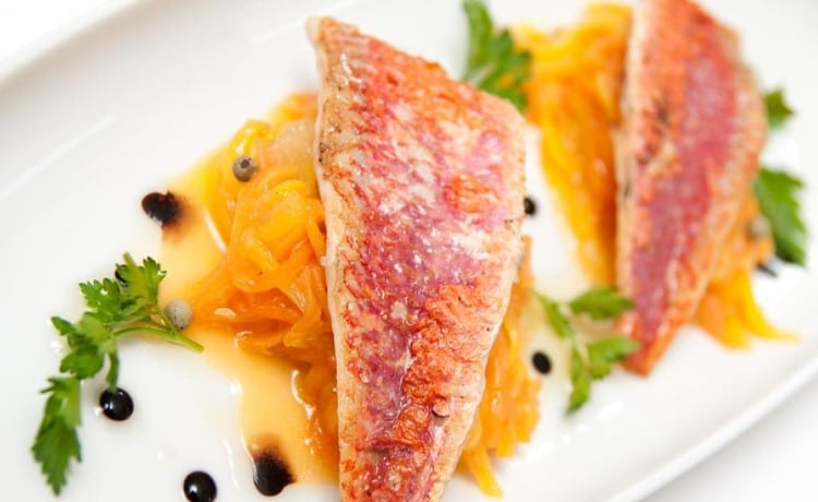 Filet de rouget sur carpaccio de poire à la vinaigrette aigre-Douce