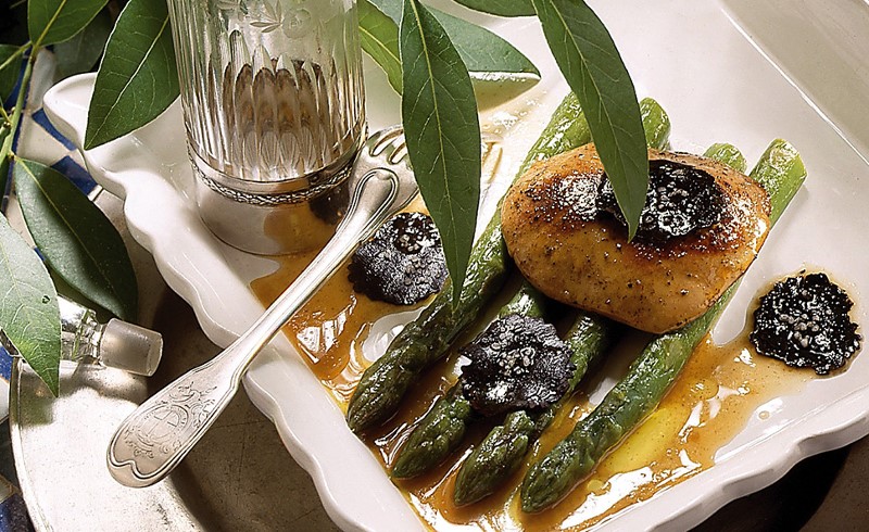 Asperges vertes et escalope de foie gras aux lames de truffe