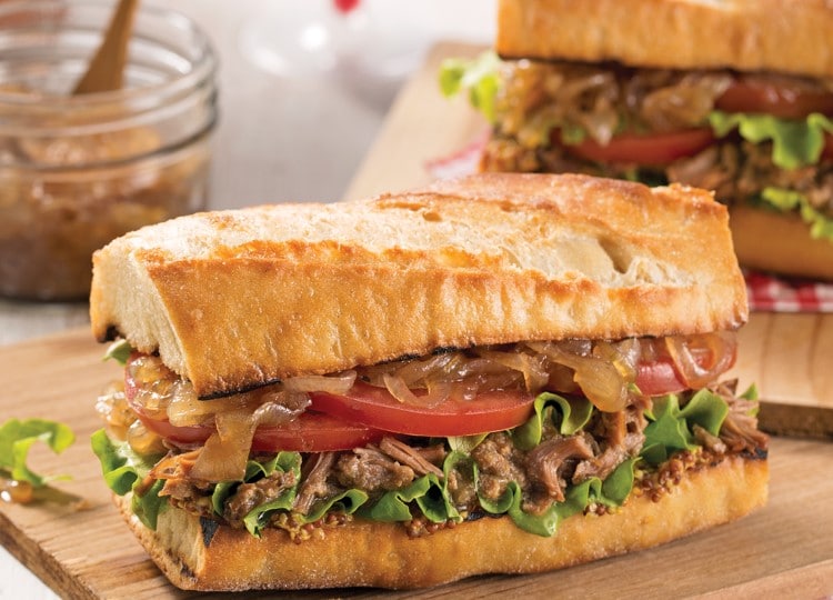 Sandwich aux rillettes, oignons confits et crudités