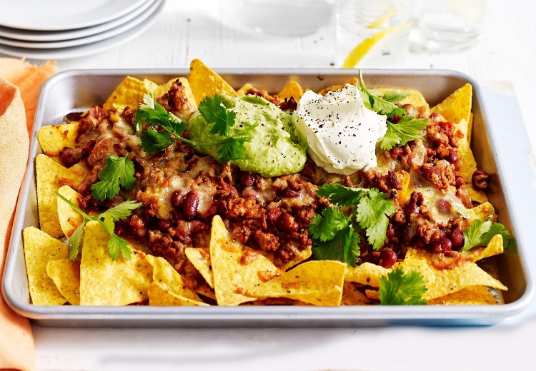Nachos aux haricots rouges, guacamole et crème fraîche