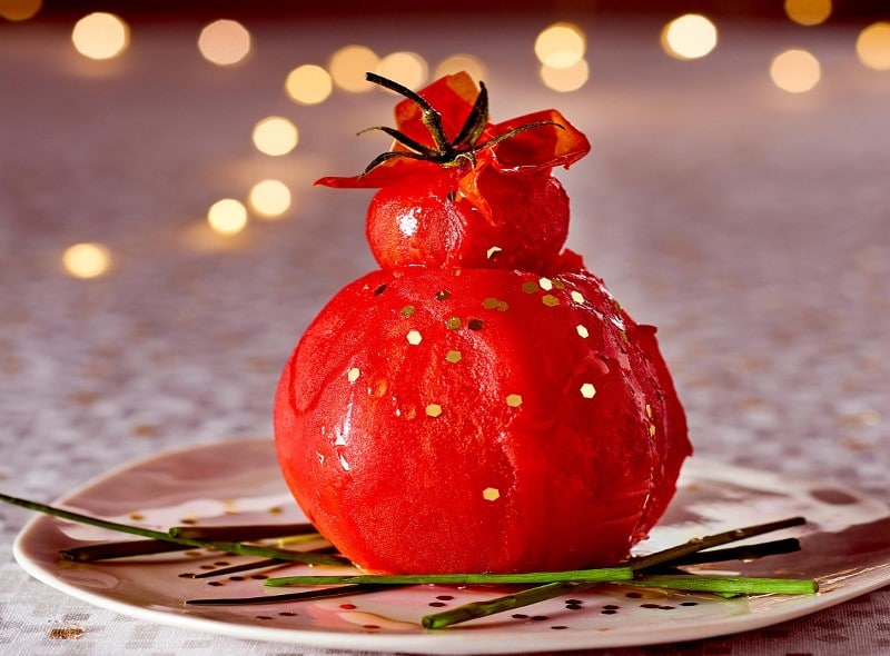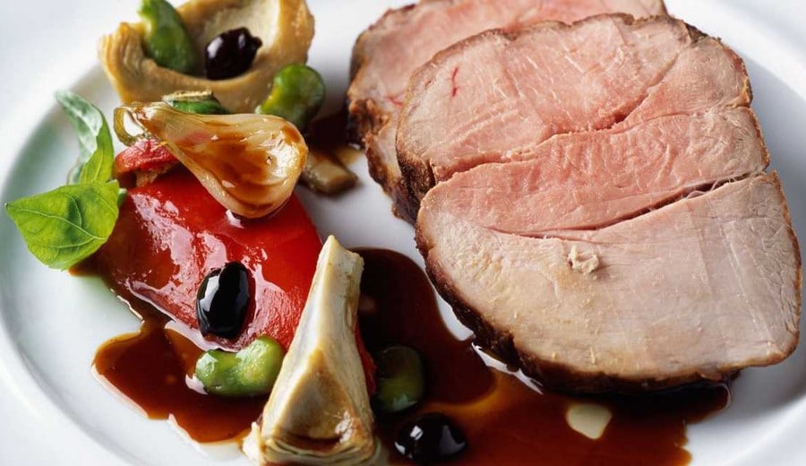 Quasi de porc rôti aux artichauts, olives noires, févettes et sauce tomate