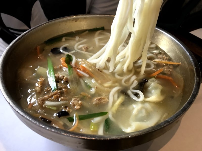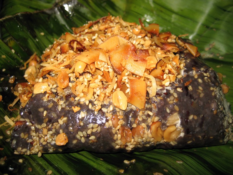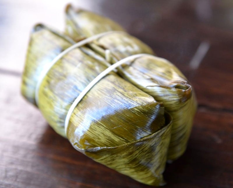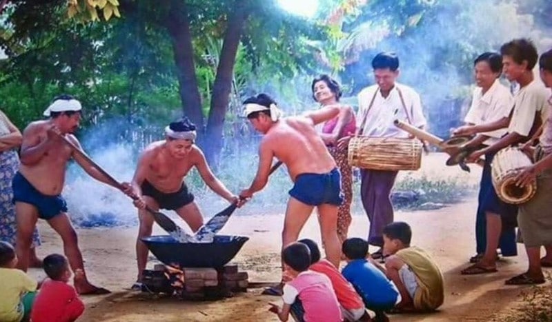 Mélange du htamanè dans un grand wok avec des spatules en bois géantes