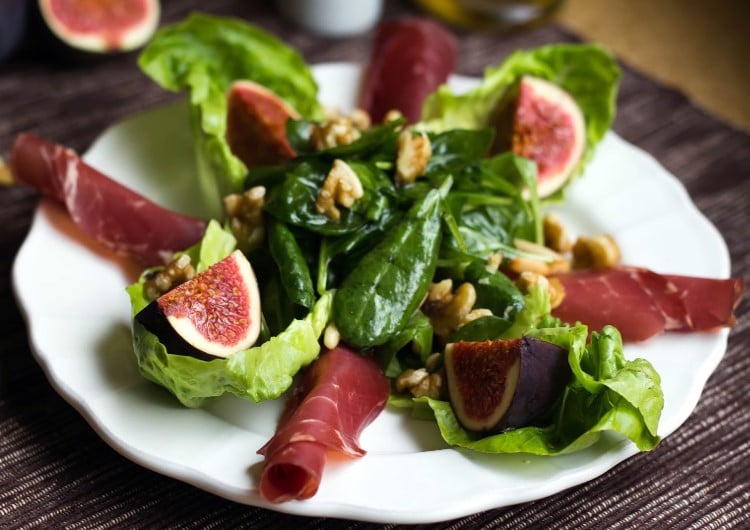 Salade de pasterma aux figues fraîches et cerneaux de noix