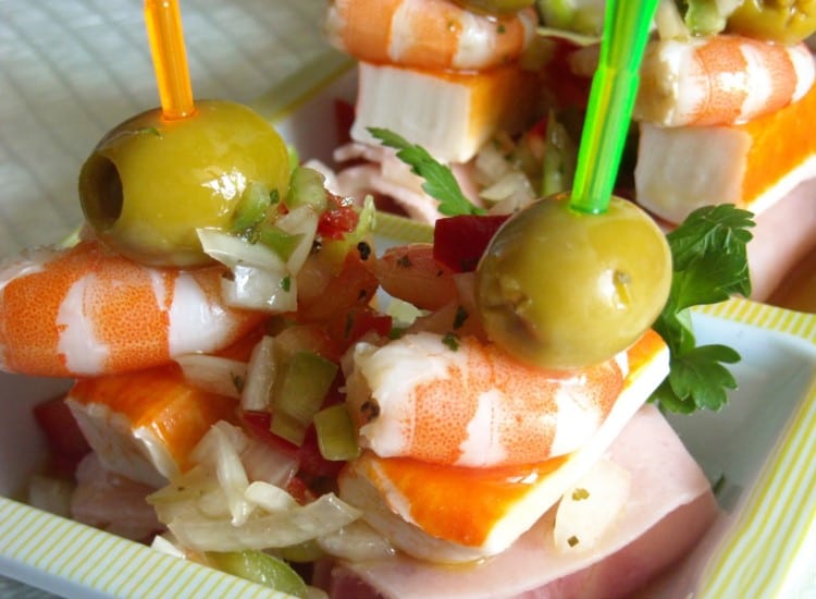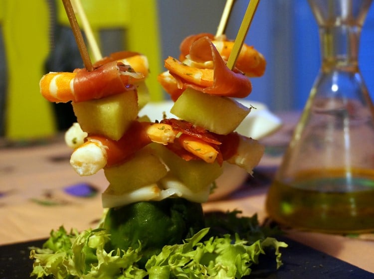 Pinxtos de jambon cru, melon et crevettes