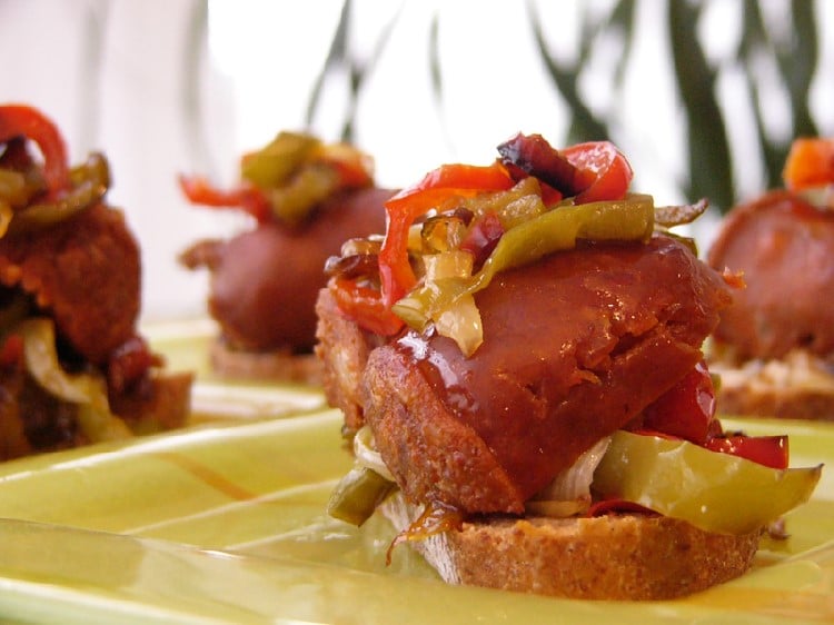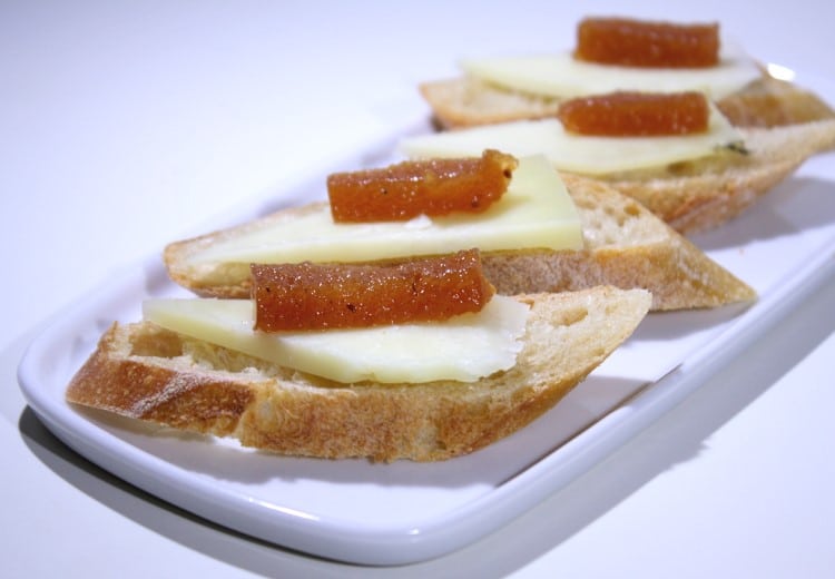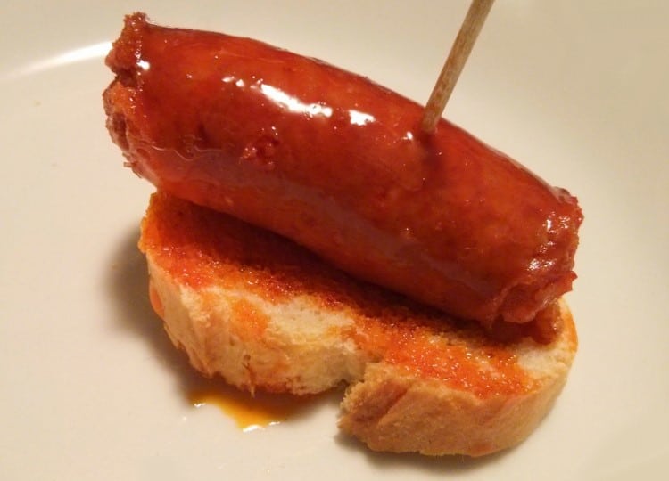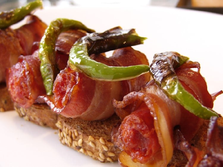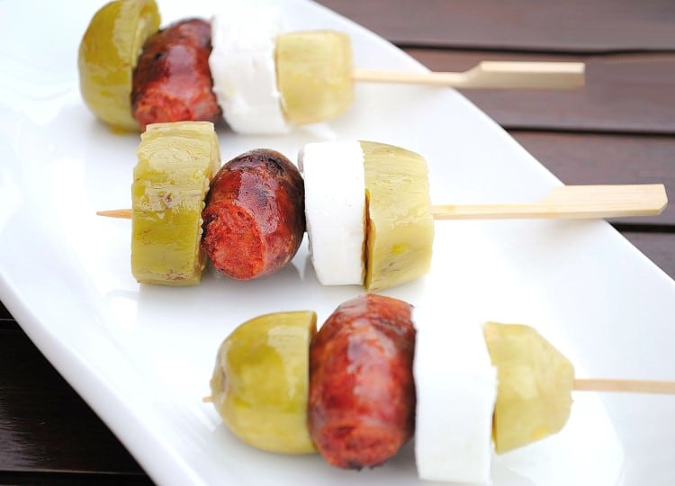 Pinxtos en brochettes de chorizo, piment et fromage frais