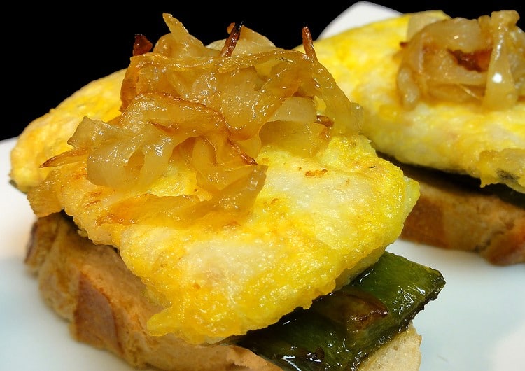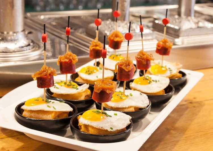 Pintxos à l’œuf au plat et brochette de chorizo à l’oignon confit