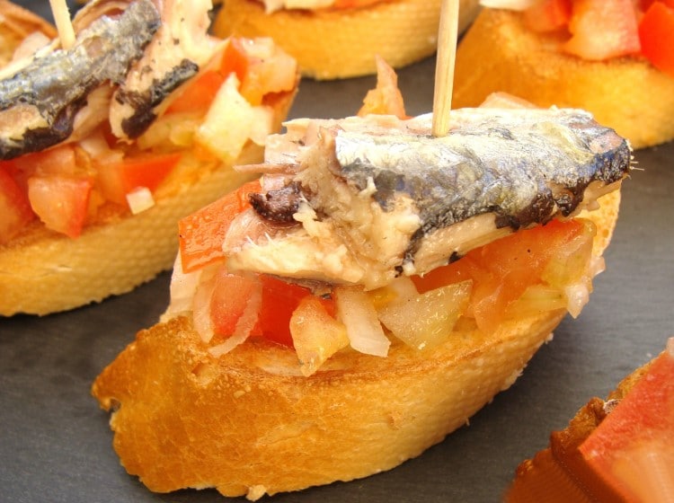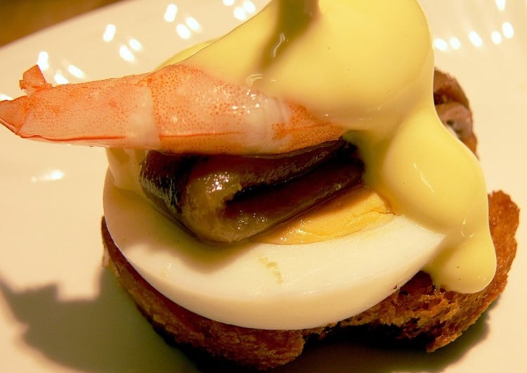 Pintxos à l’œuf dur, filet d’anchois et crevette nappée de mayonnaise