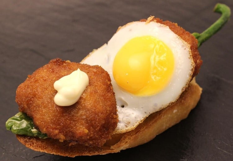 Pintxos de hamburger de poulet frit à l’œuf au plat et piment frit