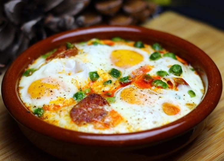 Pintxos en cassolette d’œuf à la flamenca (chorizo, sauce tomate et légumes)
