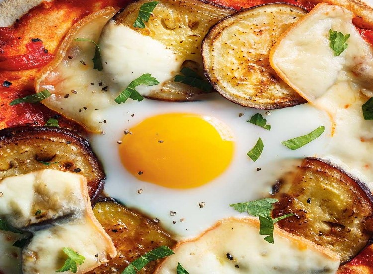 Pizza Capricciosa (jambon cru, œuf, aubergines et olives)
