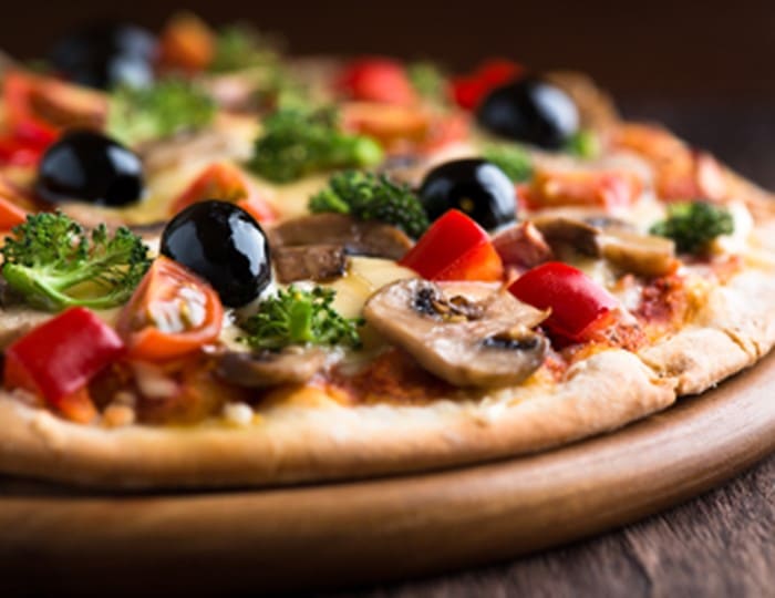 Pizza Quatre-saisons (jambon cuit, champignons, poivrons, olives noire, cœurs d’artichauts)