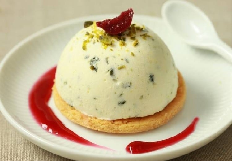 Parfait glacé à la verveine, pistaches et coulis de framboise