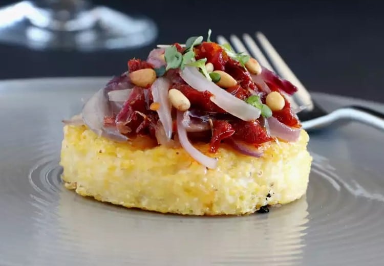 Bouchée de polenta au jambon de parme, oignons et pignons