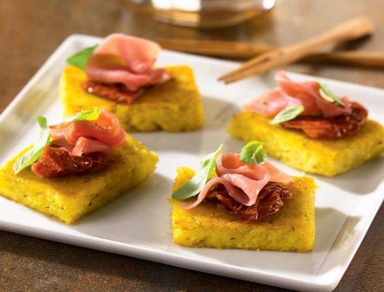 Toasts de polenta au pesto rouge et jambon de Parme