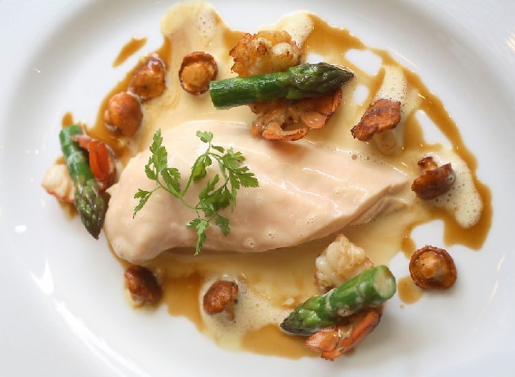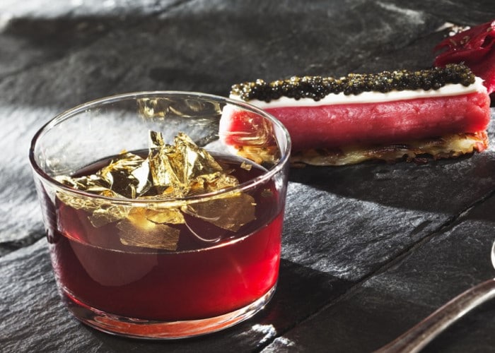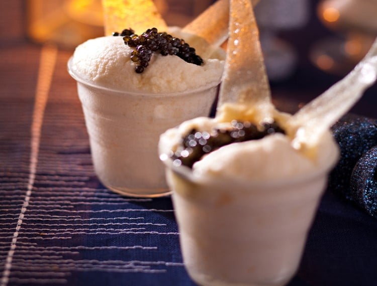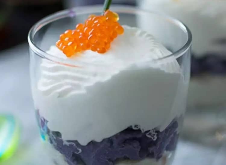 Verrine de mousse de vitelotte et crème chantilly aux œufs de saumon
