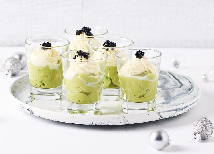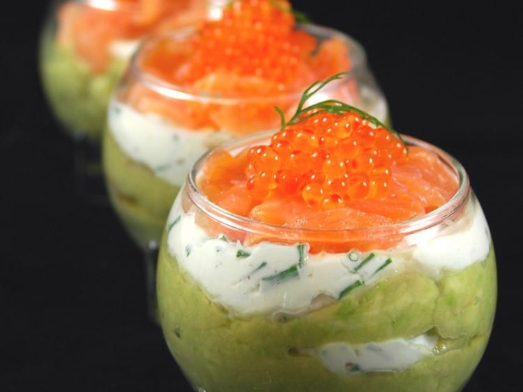 Verrine d’avocat et de truite fumée à la crème aux herbes et œufs de saumon
