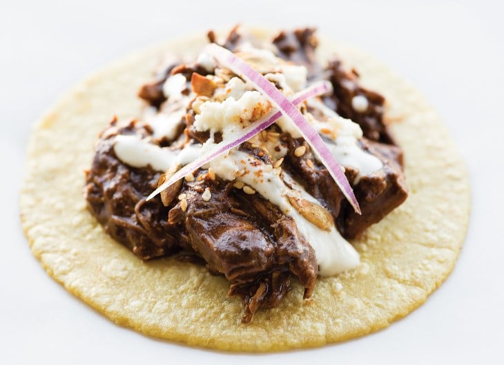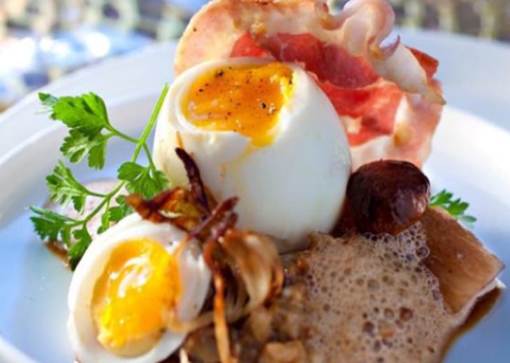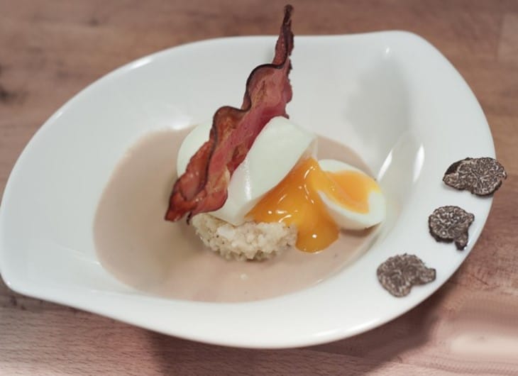 Œuf mollet sur risotto de chou-fleur, lames de truffe et velouté à la châtaigne